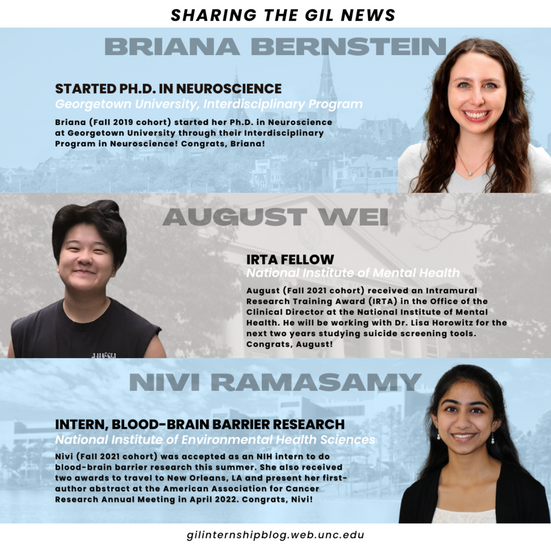 Sharing the ‘Gil’ NewsgilinternshipSep 27, 20221 min readUpdated: Aug 25, 2024Our fall edition of Sharing the ‘Gil’ News is here! Check out the recent accomplishments of our fabulous Gil alumni: